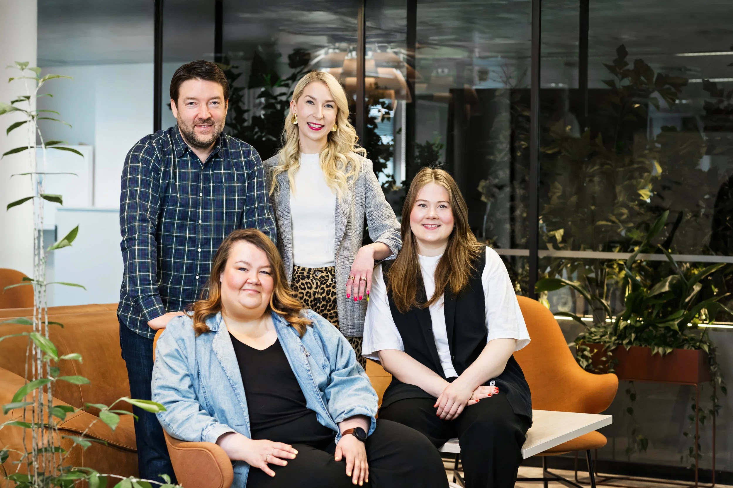 Aller markkinointipalvelut Suomi irrottaa mainonnan osaamisensa ja kasvaneet mainostoimistopalvelunsa uuden Fågel & Friends -brändin alle. Kuvassa Fågel & Friendsin myyntijohtaja Ville Helenius, liiketoimintajohtaja Niina Korhonen, Creative Director Johanna Nikama ja Art Director Rosa Seppälä. Kuva: Mari Lahti.